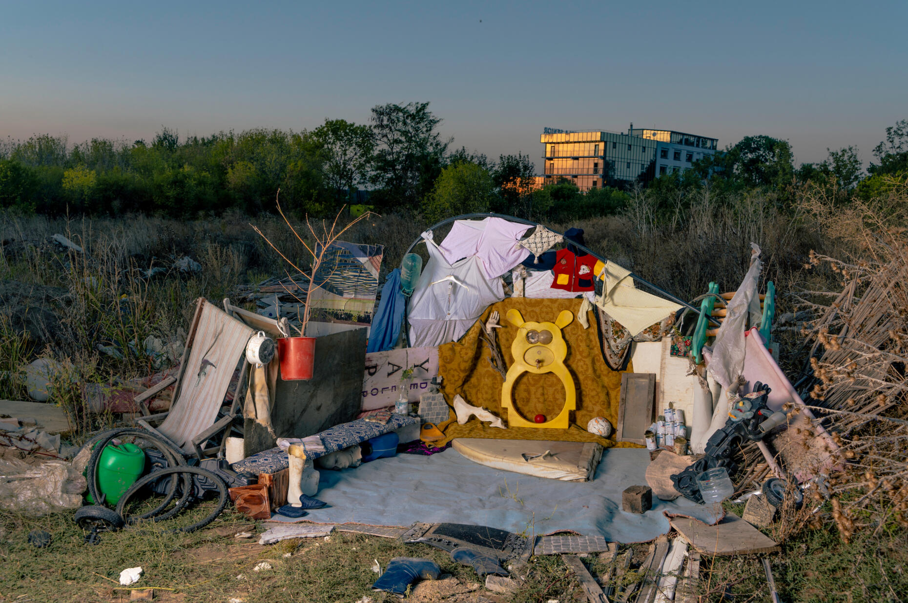 It is a project about the outskirts of Bucharest seen through the eyes of dogs. The video work integrates two dimensions of the phenomenon: a documentary perspective, where the discourse on the displacement and resilience of dogs is reflected in conversations with real people living near the fields of the Pipera/Snagov/Tâncăbești area, and a fictional, speculative dimension, in the form of a narrative about a family of dog-people who continue to live in these hostile landscapes, building their shelters from rubble, plastic debris, and household waste.