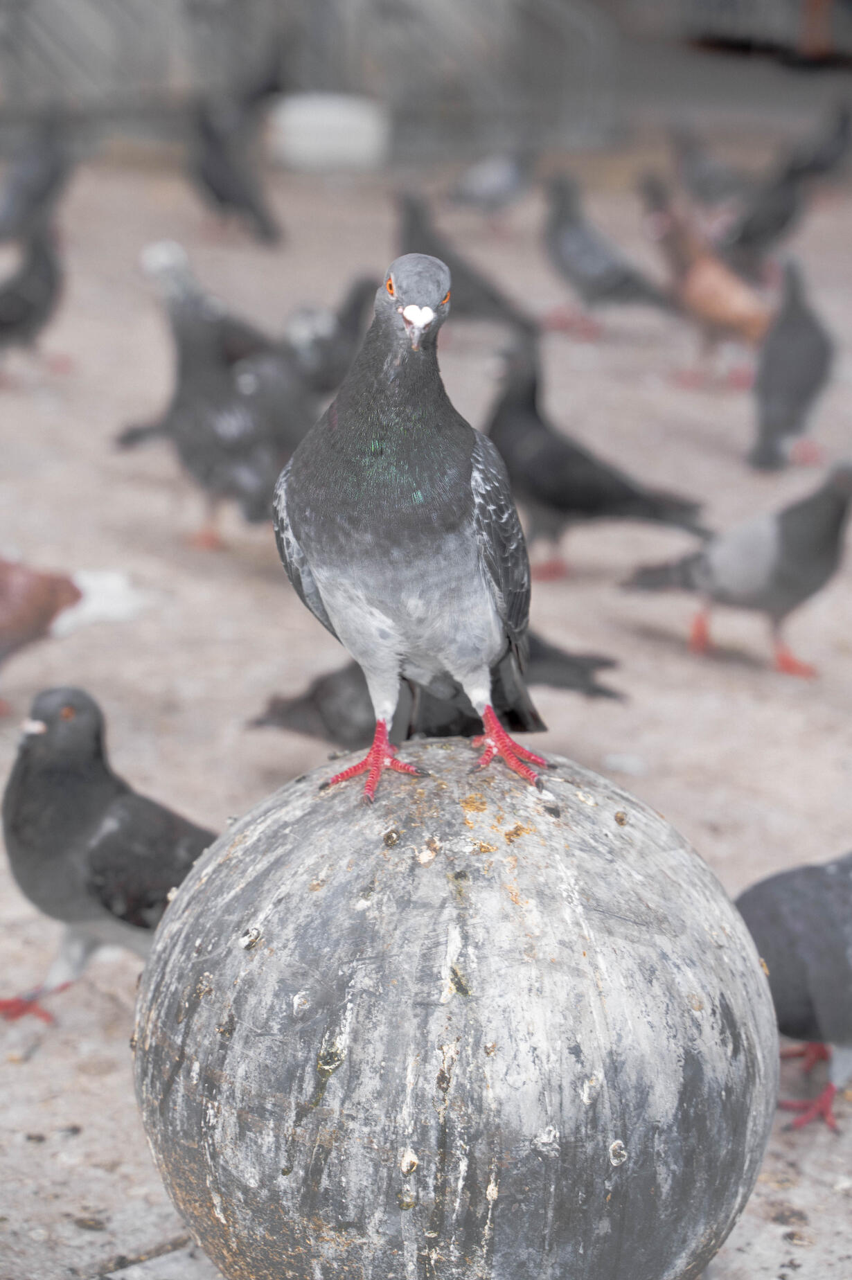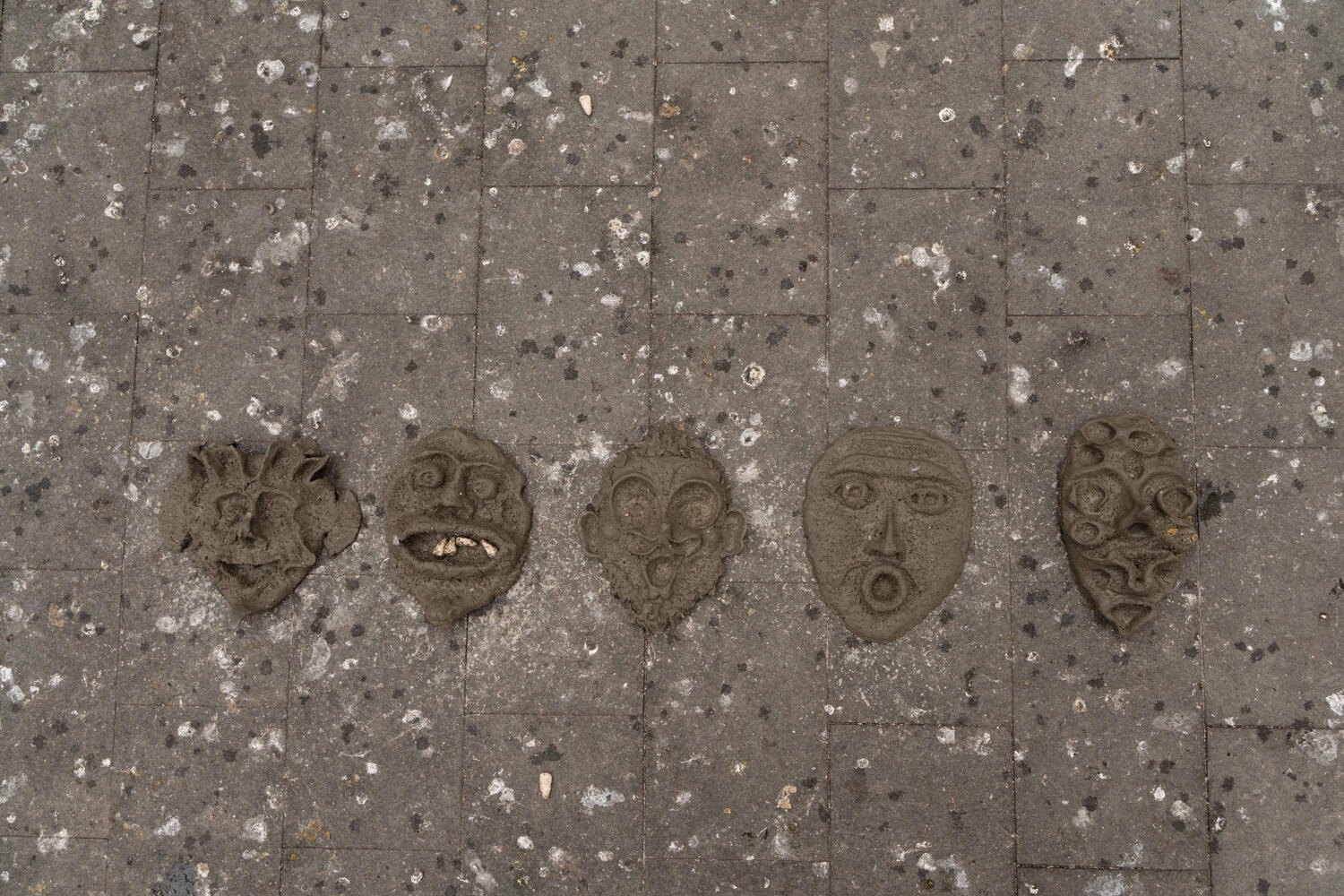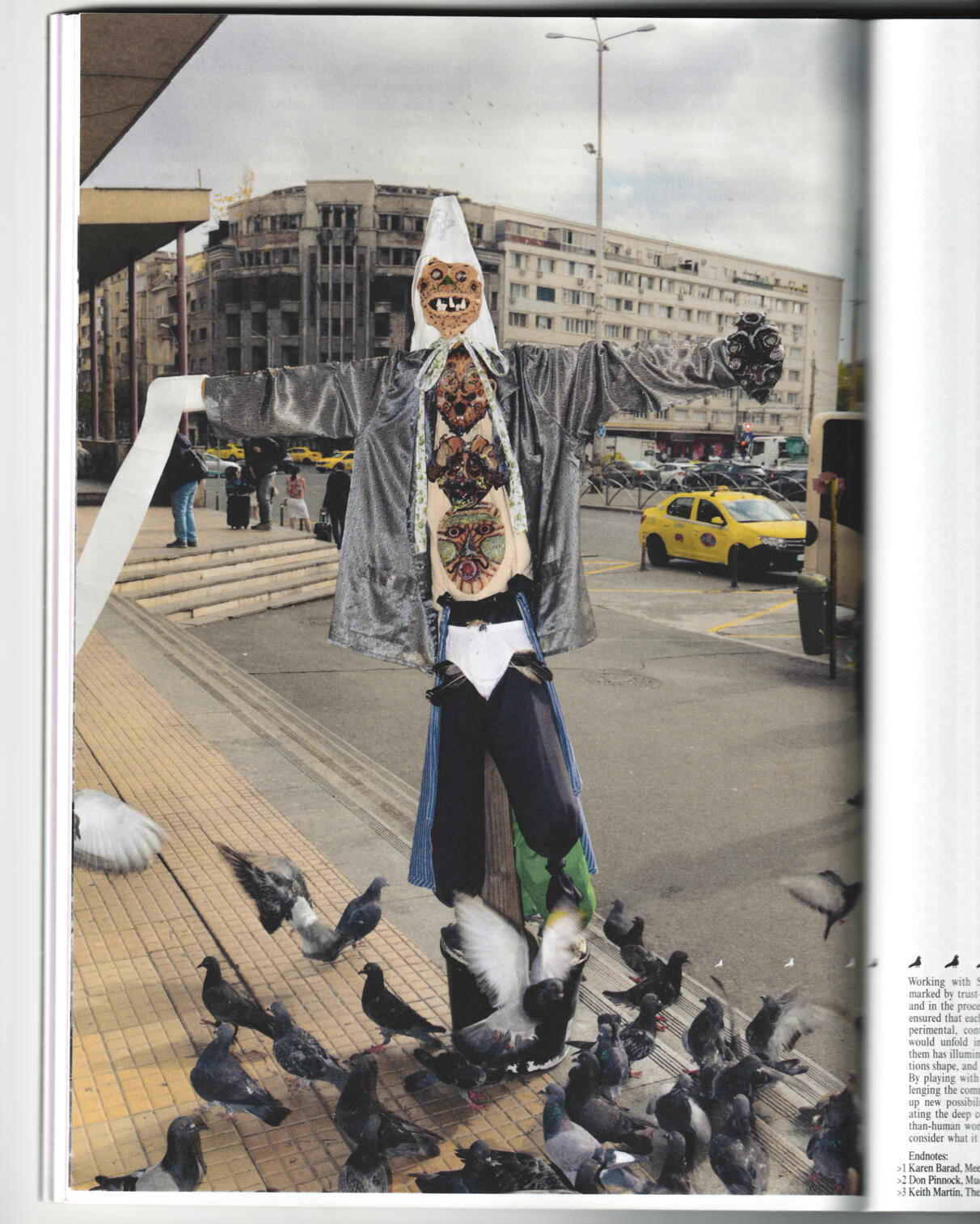 Ulterior am creat un set de măști de ceramică pentru a face o sperietoare de păsări menită să atragă porumbeii. Realizarea măștilor a fost făcută în colaborare cu porumbeii. Am pus semințe pe ele în locuri specifice iar porumbei le-au modelat cu ciocul și picioarele pe măsură ce au extras semințele din lut. Sperietoarea de păsări a fost asamblată și fotografiată în compania porumbeilor la Gara de Nord.