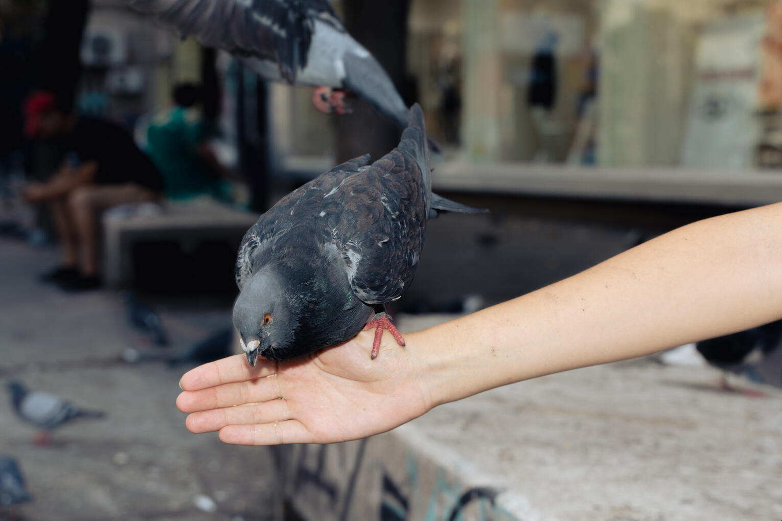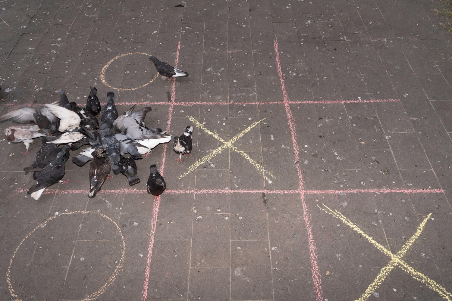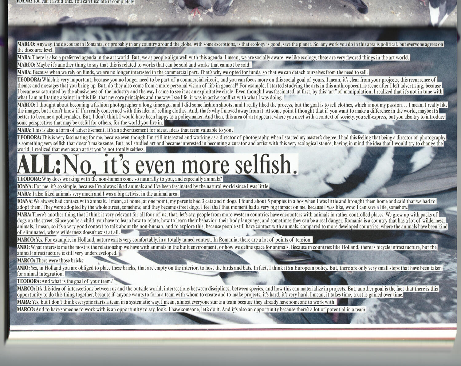 Inițial am fotografiat în stil documentar porumbeii din București, locurile în care se adună și oamenii care îi hrănesc. Am continuat prin a dezvolta o variație a jocului X și 0 care implică coordonarea porumbeilor prin hrănirea lor. Această descoperire, faptul că porumbeii pot fi coordonați prin tranzacționarea de semințe, a definit metodologia proiectului, adresând atât conceptul de tranzacție cât și colaborarea între oameni și animale. Aceasta fiind una din temele principale pe care le adresează asociația.