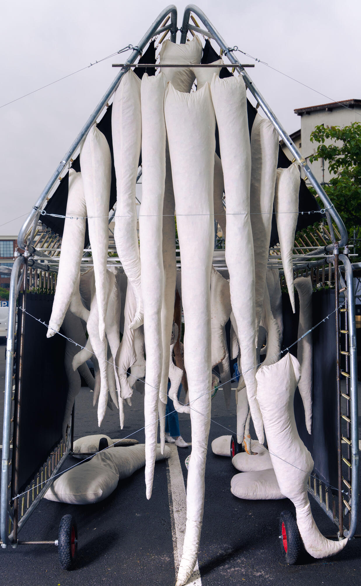 The project consists of an installation centered around a pice of video art. The video piece has both a constructed, fictional aspect and a documentary side.The fictional aspect includes a set built from construction materials and discarded objects found in a field on the northern outskirts of Bucharest, as well as costumes featuring prosthetic masks made of silicone. The documentary aspect consists of interviews and observational documentary footage capturing the northern outskirts of Bucharest.The installation was built using the same materials as the set.